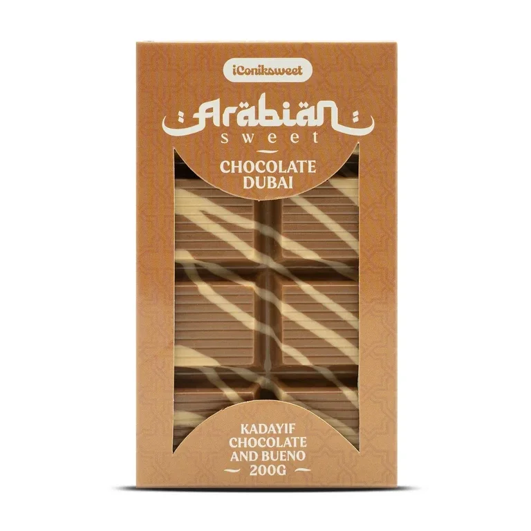 Un véritable bijou sucré venu de Dubaï. Cette tablette généreuse marie l’onctuosité du chocolat au lait à la douceur iconique du goût "Bueno", le tout relevé par un cœur de kadayif croustillant. Un contraste parfait entre fondant et croquant, pour une dégustation luxueuse et réconfortante. Format 200g, parfaite à partager… ou à garder rien que pour soi.